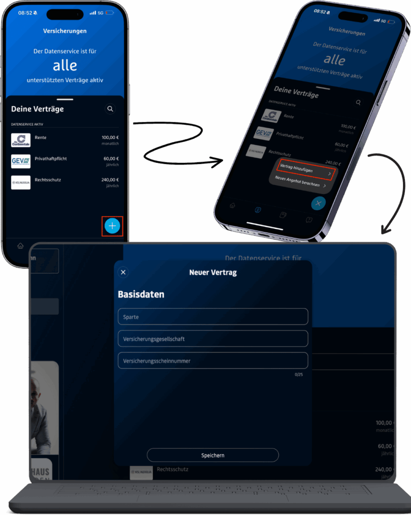 • Vertrag anlegen: Versicherer, Sparte, Tarif/Beginndatum, Versicherungsnehmer.